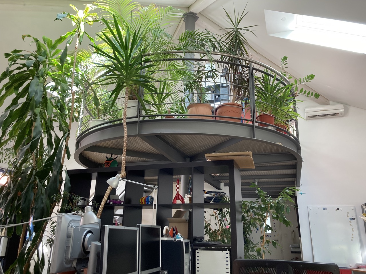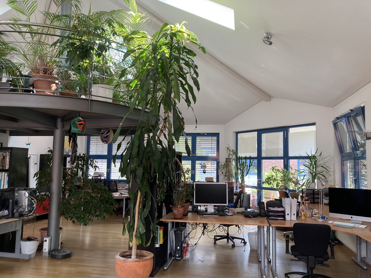 Unser (nach Aussagen von Besuchern "wunderschönes") Büro besteht aus einem großen hellen Raum mit Pyramidendach und einer Empore, viel Grünpflanzen, Fenstern von drei Seiten, einem Balkon (mit noch mehr Pflanzen), einer eingerichteten Küche mit Spüle, Kochplatten, Spülmaschine und Kühlschrank. Zwei Toiletten gibts auch. Internetanschluss / Gigabit Kabel ist vorhanden. Und eine Klimaanlage für die richtig heissen Tage.