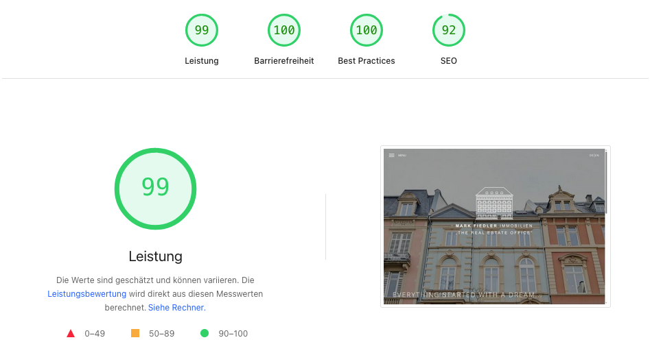 Neben der Gestaltung lag auch die technische Umsetzung in einer Hand, so konnten wir sehr früh mit und im Browser gestalten und dabei Interaktivität und Responsivität, die sich sonst nur näherungsweise über Screens vermitteln lässt, in Prototypen abstimmen. Das Ergebnis: eine elegante Website, die in allen Kernbereichen nahezu perfekte Werte bei Google PageSpeed Insights erreicht.
